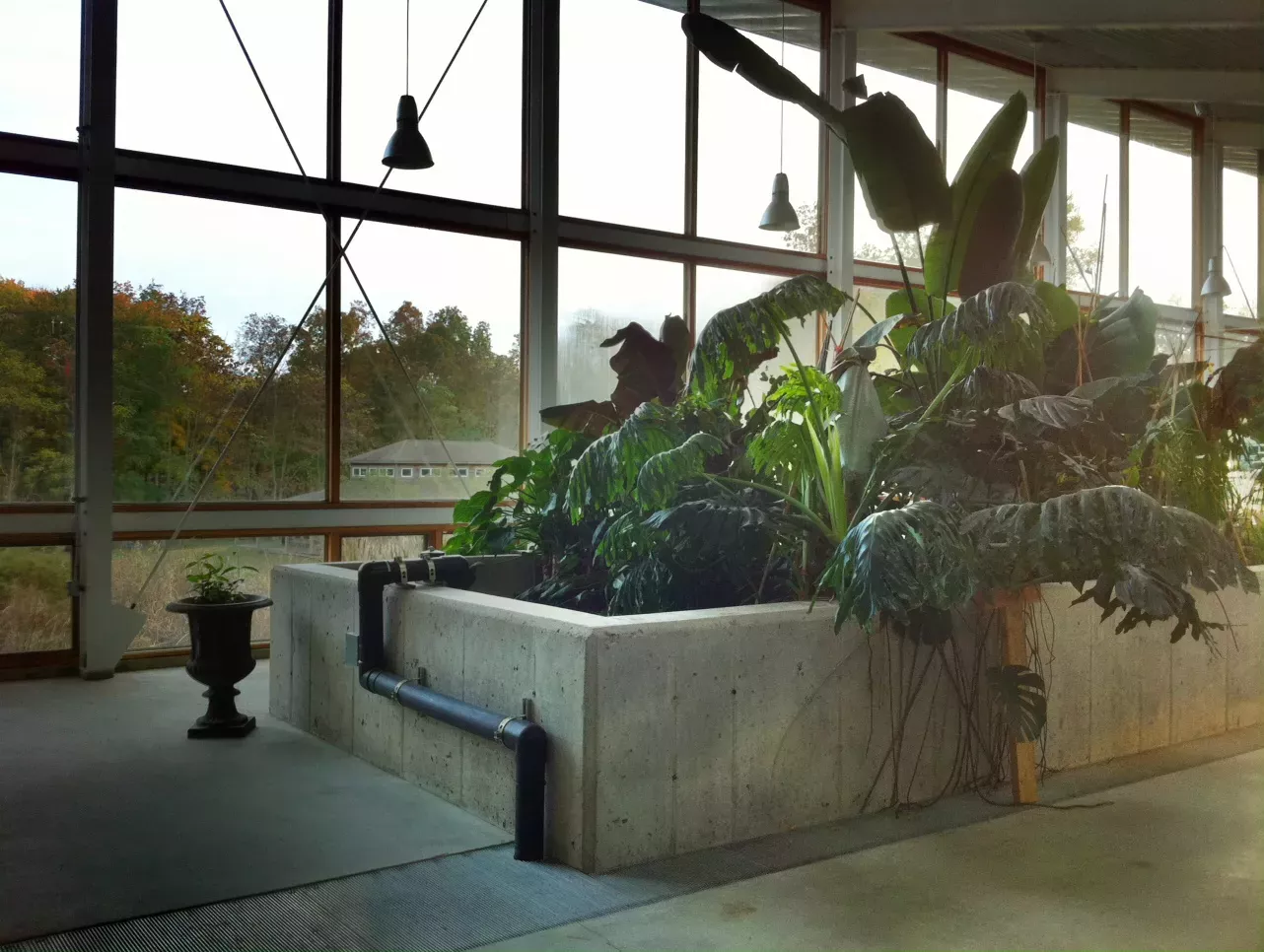 聽起來逼格很高?其實污水處理真沒有什么奧秘,其處理原理就很簡單。一開始,所有污物像人類排泄物和“灰水”例如廁所、洗手盆和淋浴等產生的廢水送入儲罐收集,然后輸送至生態機器。第二階段是用兩個18立方米的化糞池和缺氧池作為調節預處理,出入流水四個造濕地,內襯橡膠,堆滿碎石,利用依附在植物根系上的生物膜對污水作進一步凈化。據說此時污染物去除已達75%。第三階段是好氧曝氣池,一個多級食物鏈的生態系統,去除大部分的營養物。最后經循環砂濾后,廢水就已經變成符合標準的家庭用的清潔水源。這個生態機器是一個現代溫室構造,太陽光伏板供電,里邊還能用作瑜伽課室。