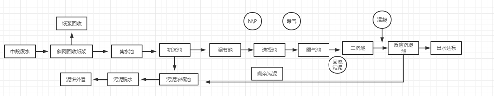 中段廢水預處理由斜網過濾、初沉池以及調節池等組成。本工藝中采用斜網代替常規的格柵來回收紙漿纖維,分離出的紙漿回用到造紙工藝中,廢水則進入集水池,以潛污泵提升至沉淀池,進步一去除廢水殘留的紙漿纖維等懸浮物。初級沉淀池出水則自流進入調節池,均化水質、水量,減少對后續生物處理過程的沖擊。
